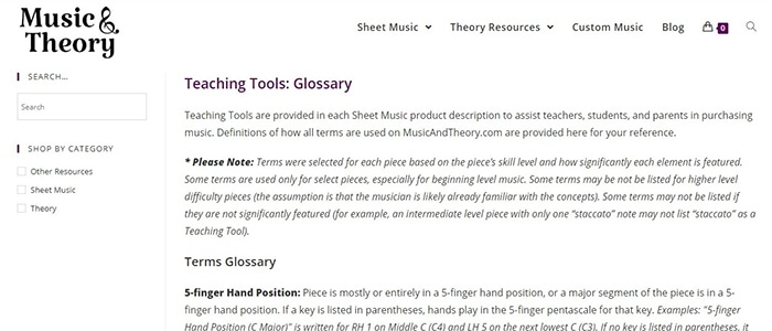 The "Teaching Tools" Glossary on MusicAndTheory.com is a list of terms, all musical and educational concepts, that may apply to the pieces on this site. For every piece I upload, I go through the Teaching Tools and list the relevant terms. These Teaching Tools (terms) are included in each Sheet Music product description. I also add new concepts to the Teaching Tools Glossary as they appear in new pieces.